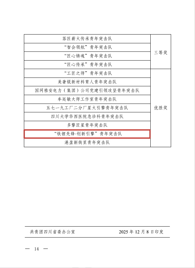 近日,由共青团四川省委等19个部门联合举办的2025年四川省六大优势产业青年立功竞赛圆满落幕。本次竞赛面向全省“15+N”重点产业领域的中央企业、国有企业、高校及新兴领域青年突击队,共吸引960支队伍参赛,设置“赛创新、赛效率、赛质量、赛安全、赛育人”五大赛项。蜀能矿产“铁锂先锋,创新引擎”青年突击队凭借在磷酸铁锂正极材料研发领域的突出成效,荣获“赛育人”赛道优胜奖。
