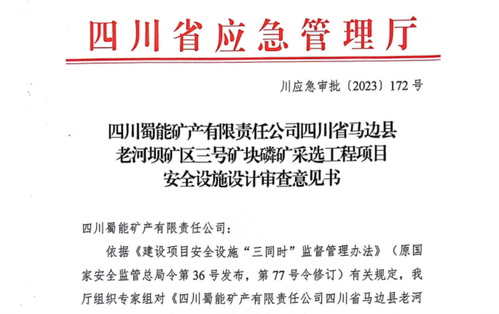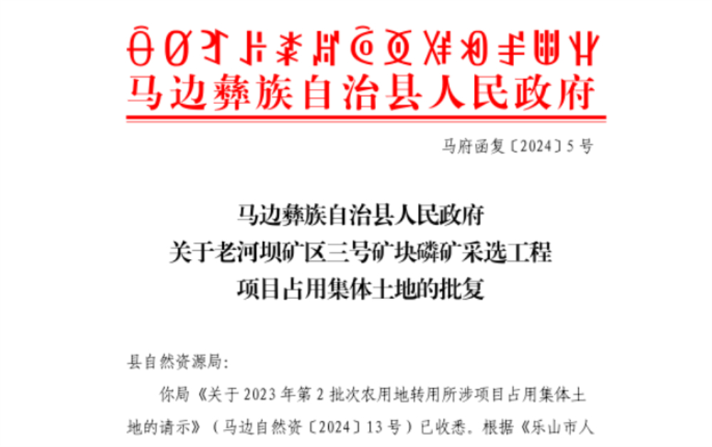 2024年1月18日,三号矿山项目用地农转用申请取得马边县政府批复,成为省内该批次首个完成农转用审批的项目。