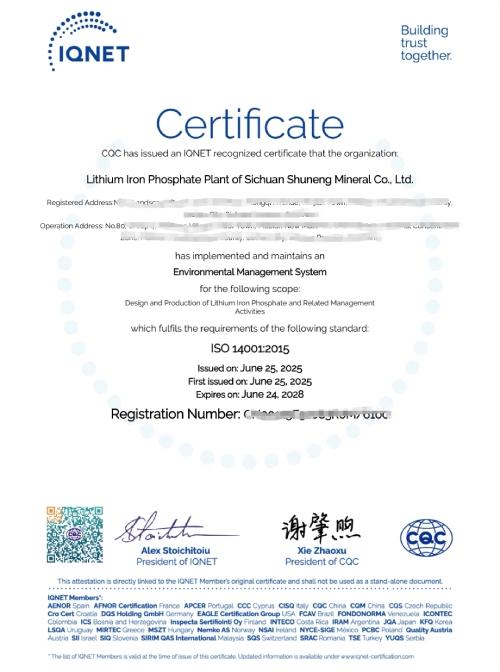 2025年6月25日,磷酸铁锂厂成功通过ISO14001环境管理体系认证。
