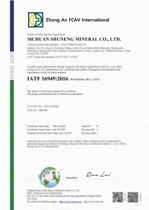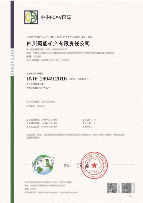 2025年10月24日,蜀能矿产公司顺利通过IATF16949质量管理体系认证。