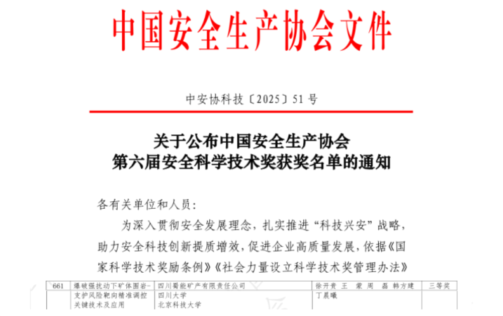 2025年12月19日,公司与四川大学、北京科技大学合作的科研项目《爆破强扰动下矿体围岩—支护风险靶向精准调控关键技术及应用》获得中国安全生产协会第六届安全科学技术进步奖三等奖。
