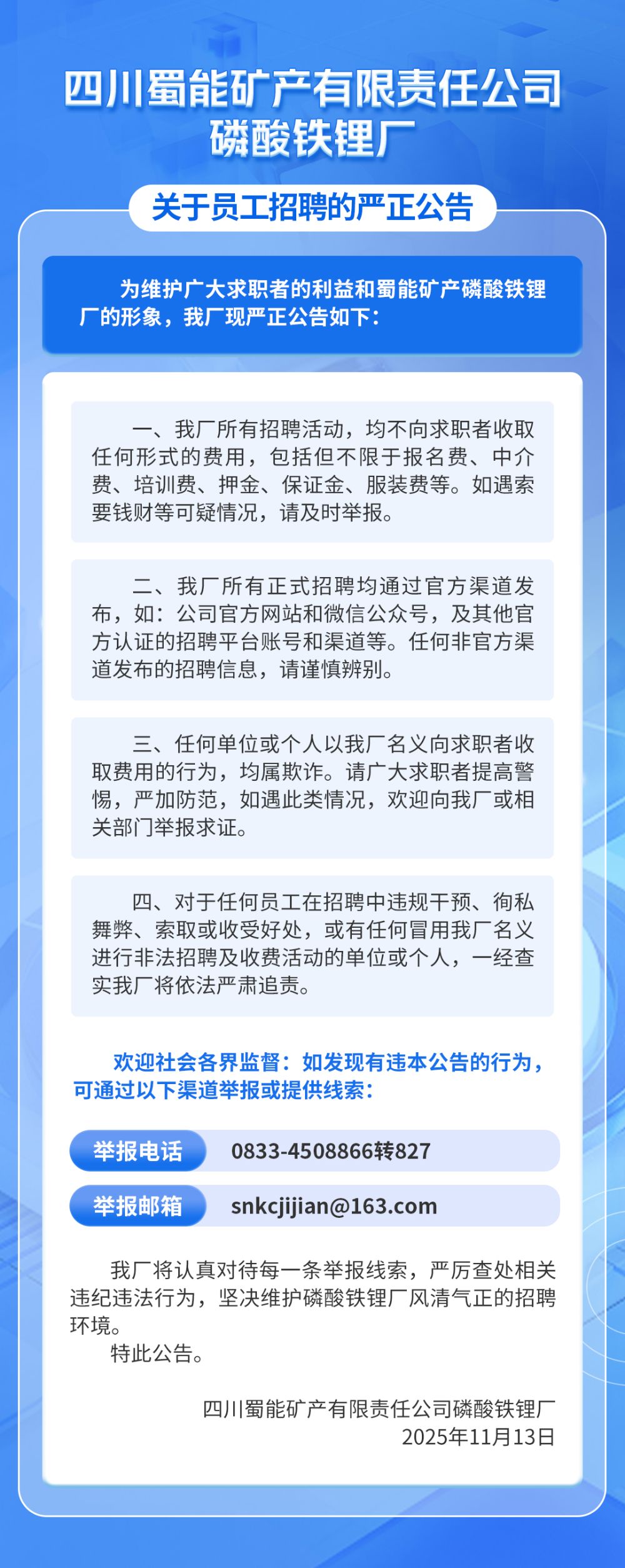 四川蜀能矿产有限责任公司磷酸铁锂厂关于员工招聘的严正公告
