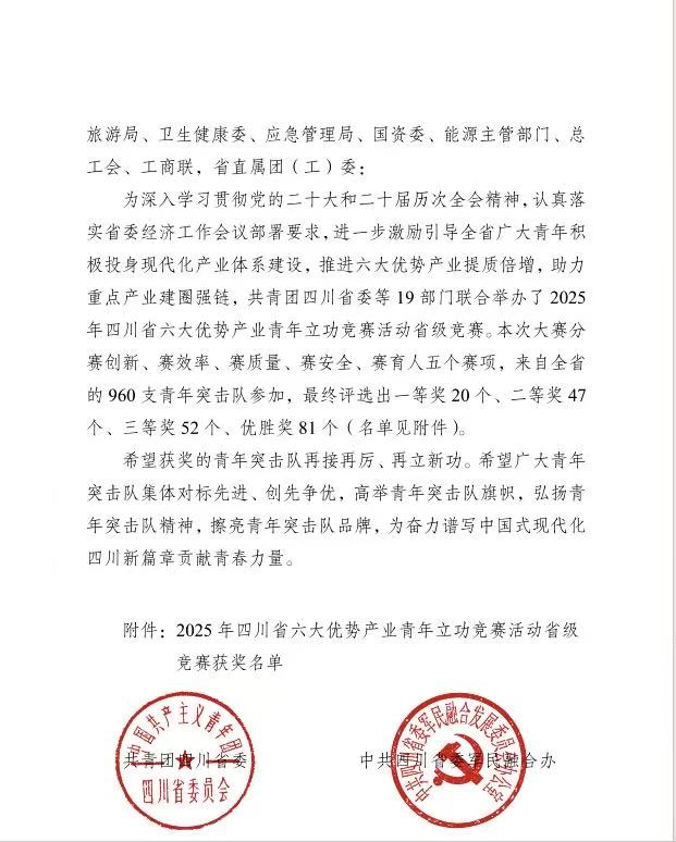 近日,由共青团四川省委等19个部门联合举办的2025年四川省六大优势产业青年立功竞赛圆满落幕。本次竞赛面向全省“15+N”重点产业领域的中央企业、国有企业、高校及新兴领域青年突击队,共吸引960支队伍参赛,设置“赛创新、赛效率、赛质量、赛安全、赛育人”五大赛项。蜀能矿产“铁锂先锋,创新引擎”青年突击队凭借在磷酸铁锂正极材料研发领域的突出成效,荣获“赛育人”赛道优胜奖。