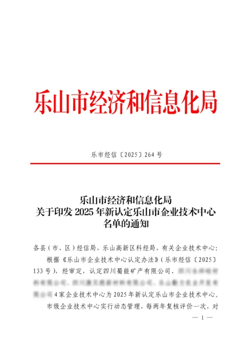 近日,蜀能矿产顺利通过“2025年乐山市企业技术中心”认定。该认定是地方政府对企业成立以来在科技创新体系构建、技术研发实力积累以及创新成果转化成效等方面的充分肯定,标志着公司科研平台建设迈入新阶段。